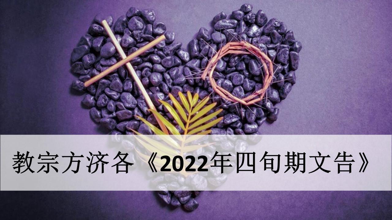 四旬期引领我们走向耶穌基督圣死与复活的逾越奥迹,这也是我们个人及团体都得以更新的良机。在2022年的四旬期,我们可以默想圣保禄宗徒对迦拉达人的规劝:「我们行善不要厌倦;如果不松懈,到了适当的时节,必可收获。所以,我们一有机会,就应向众人行善。」(迦六 9-10)
