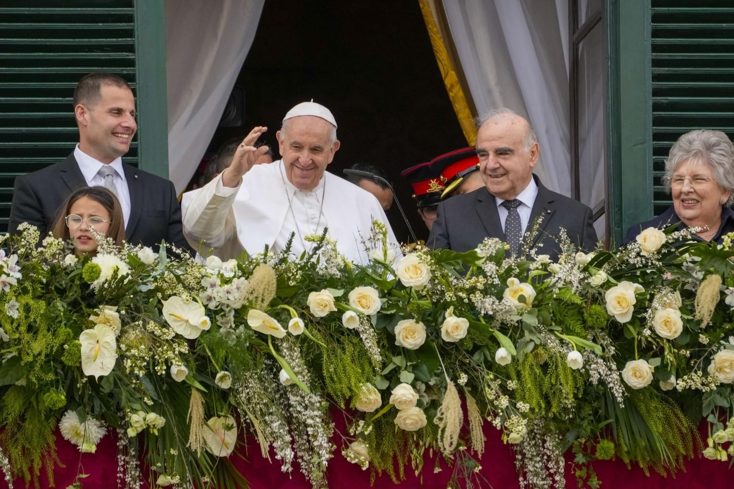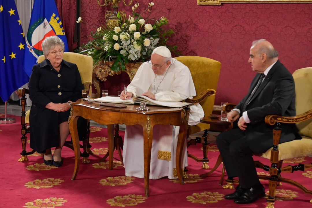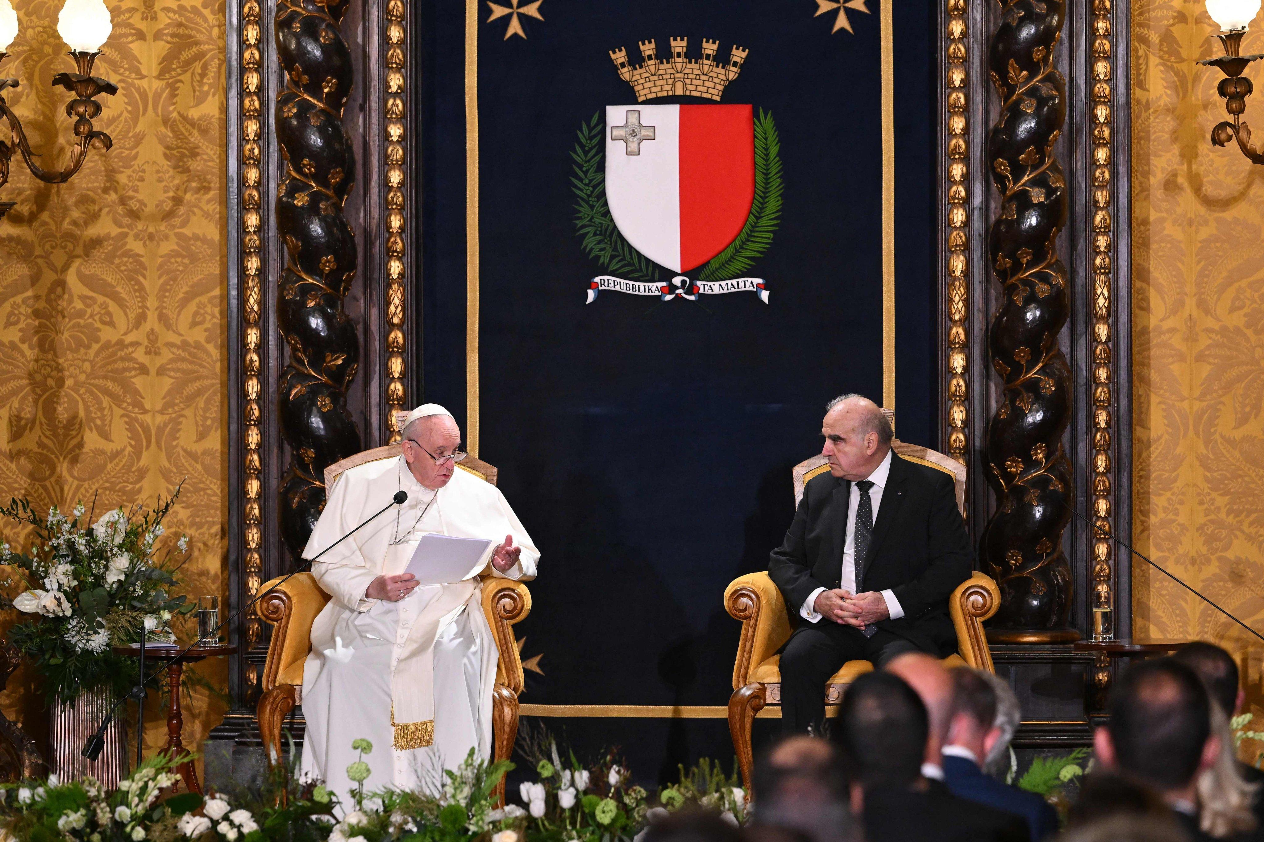 上午11:50左右,在总统府会见马耳他当局和外交使团期间,教宗发表了他本次牧灵访问的首篇讲话。在该篇讲话中,教宗用罗盘玫瑰(罗盘方位图)的比喻,鼓励位于地中海心脏部位,同时位于欧亚非三大洲交汇之处的马耳他,在战争寒风以及各处吹来的风中,继续掌握好方向,怀抱希望、关爱生命、接纳他人、追随和平。会见结束之后,教宗从总统府阳台,问候了马耳他人民。