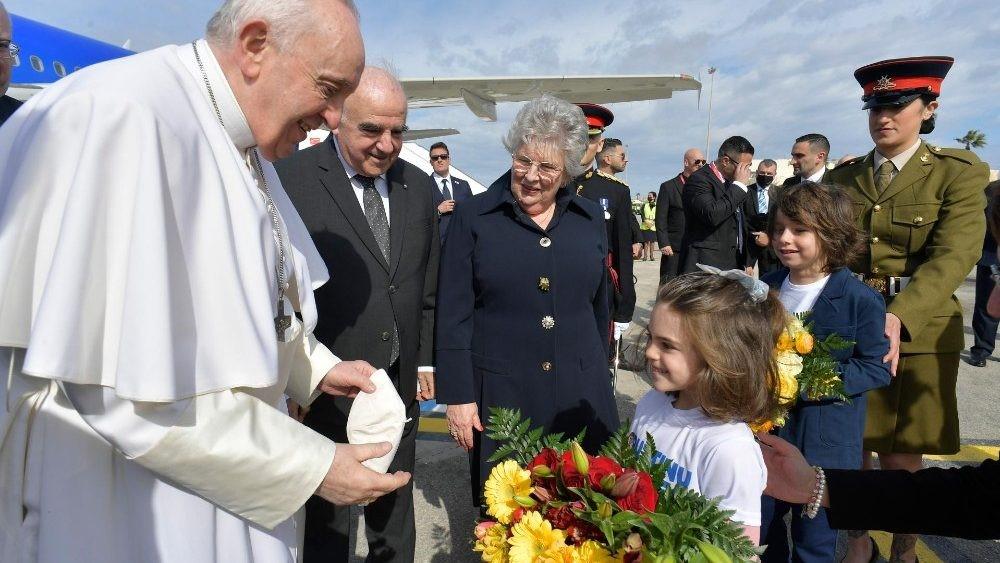 教宗于上午9:50分抵达马耳他国际机场。马耳他共和国总统乔治·维拉及夫人携各代表团到场欢迎。互相致意之后,一行人随即前往瓦莱塔的骑士团首领宫,即马耳他总统府所在地。在总统夫妇的邀请下,教宗在该国的贵宾留言簿上留下了祝福。他写到:“作为来到马耳他的朝圣者,我在这里受到了欢迎。马耳他充满着‘罕见的人性’。我祈求天主赐予执政者智慧和怜悯,并赐给人民和整个世界团结与和平。”