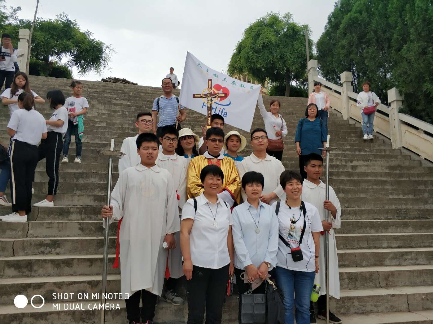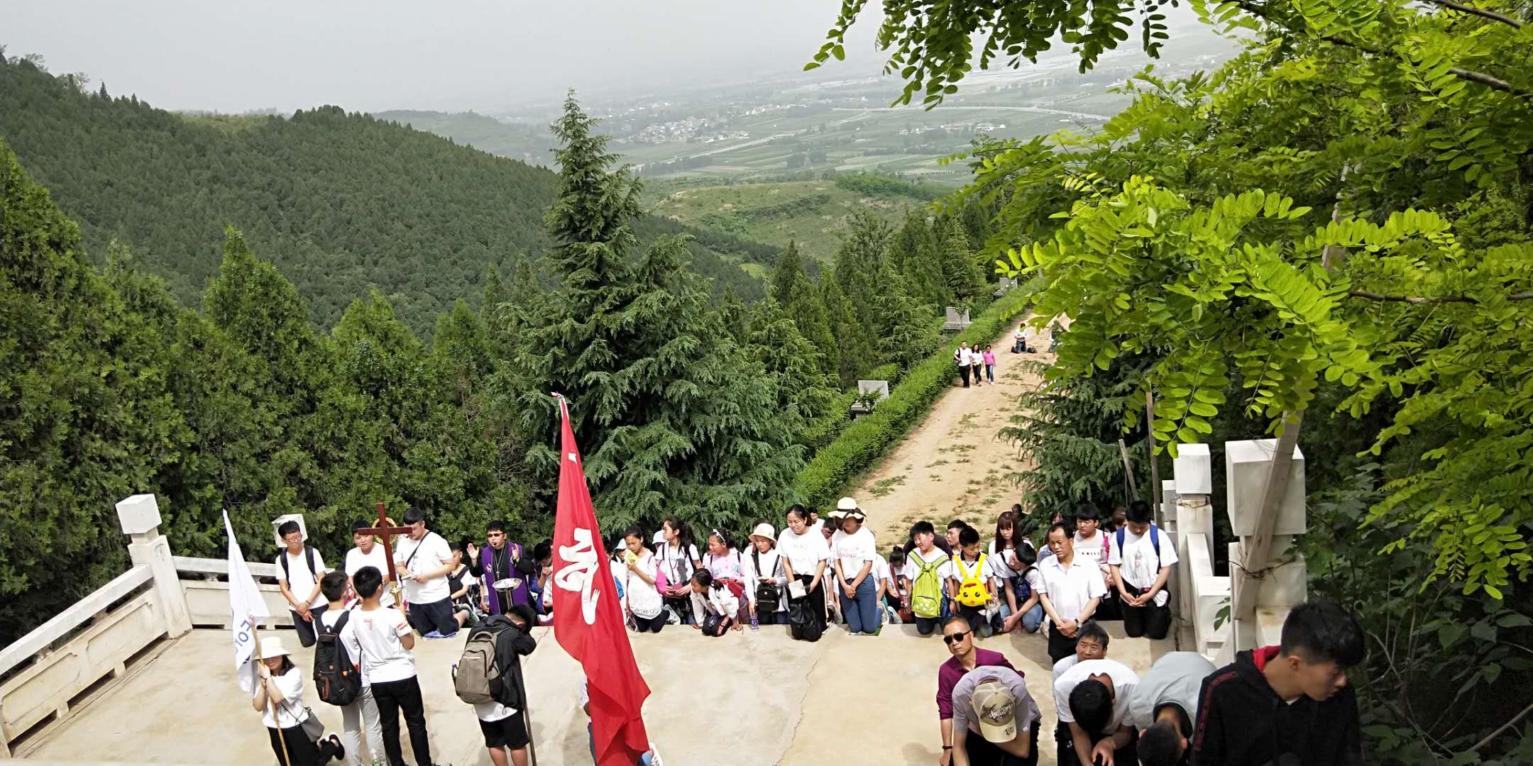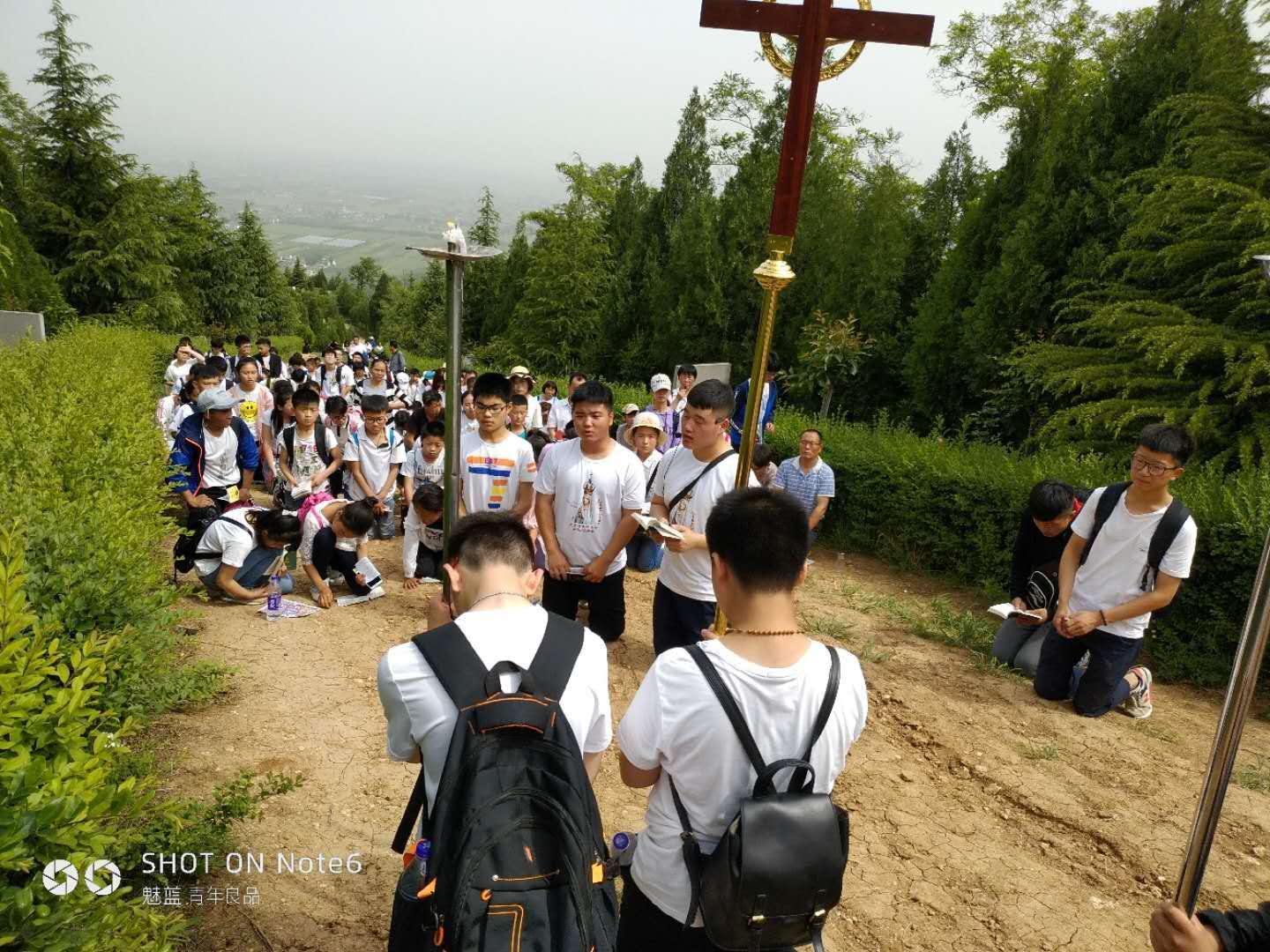浩浩荡荡的队伍排队走出武官坊大街,路上行人驻足观望,很多人竖起大拇指鼓励赞扬大家并议论说“有信仰的人真好”。在两辆大巴车与7辆面包车前后行驶到达圣母山,下车整队开始爬山,十字,蜡杆,团旗与会旗前行,大家紧随其后。由青年带领大家頌念苦路经,每到一处大家屈膝跪下,体验耶稣苦难。到达山顶做了感恩弥撒,吃了饭,每个人都向圣母妈妈献礼。