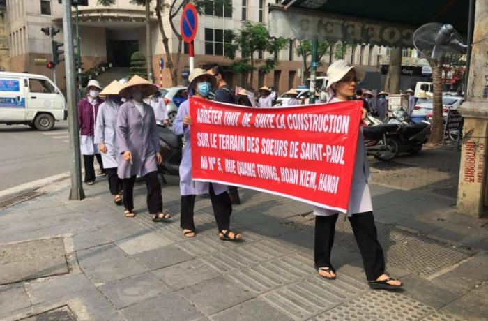 5月9日数十名来自越南圣保禄修女会的修女,在河内市中心游行位于「黄金地段」(即经济价值高的土地)的两座修女院的修女们抗议,不满该国两大城市的当局占用她们的土地。在两个地方的修女都被迫放弃有利于商业发展的产业权。为了阻止商业大楼恢复工程,一名修女试图封锁修女院的入口。她遭到一群支持工人的暴徒殴打,甚至把她打得昏迷。自2011年以来,河内总教区是这个设施的合法拥有人,在建筑上仍然可见到十字架,总主教一再抗议政府侵犯天主教徒的合法权利。在该国南部的胡志明市,共产主义政府再次要求首添新都市区(Thủ Thiêm)的圣十字爱好者团体离开他们的修道院,让该地区的新城市发展。(亚洲新闻