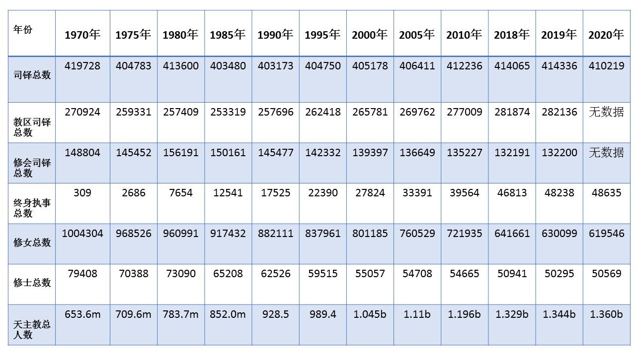 今天是世界为圣召祈祷日,《仆人微讯》特别整理了从1970年至2020年间教会司铎、修女、修士、天主教友总数的一些数据,供大家阅览及交流之用。数据来自梵蒂冈天主教会统计年鉴(Vatican's Annuarium Statisticum Ecclesiae)、官方天主教指南(The Official Catholic Directory)和美国使徒工作应用研究中心(Center for Applied Research in the Apostolate)。