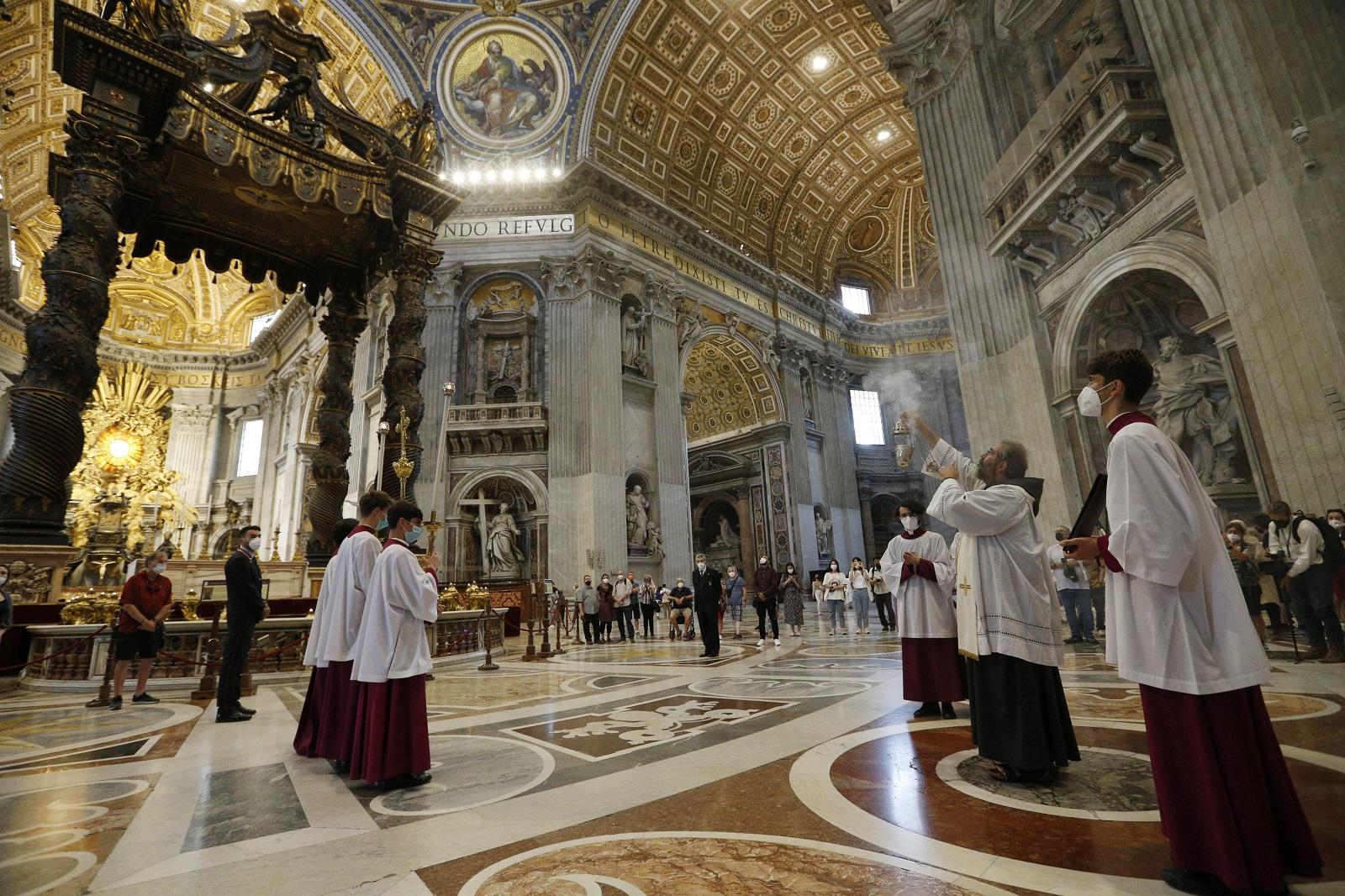 视线穿过跟随着导游参观圣伯多禄大殿的大批游客,一群朝圣者在圣殿司铎的带领下正循着“玛丽亚圣像路线 ”进行特别的祈祷,以纪念圣母月。