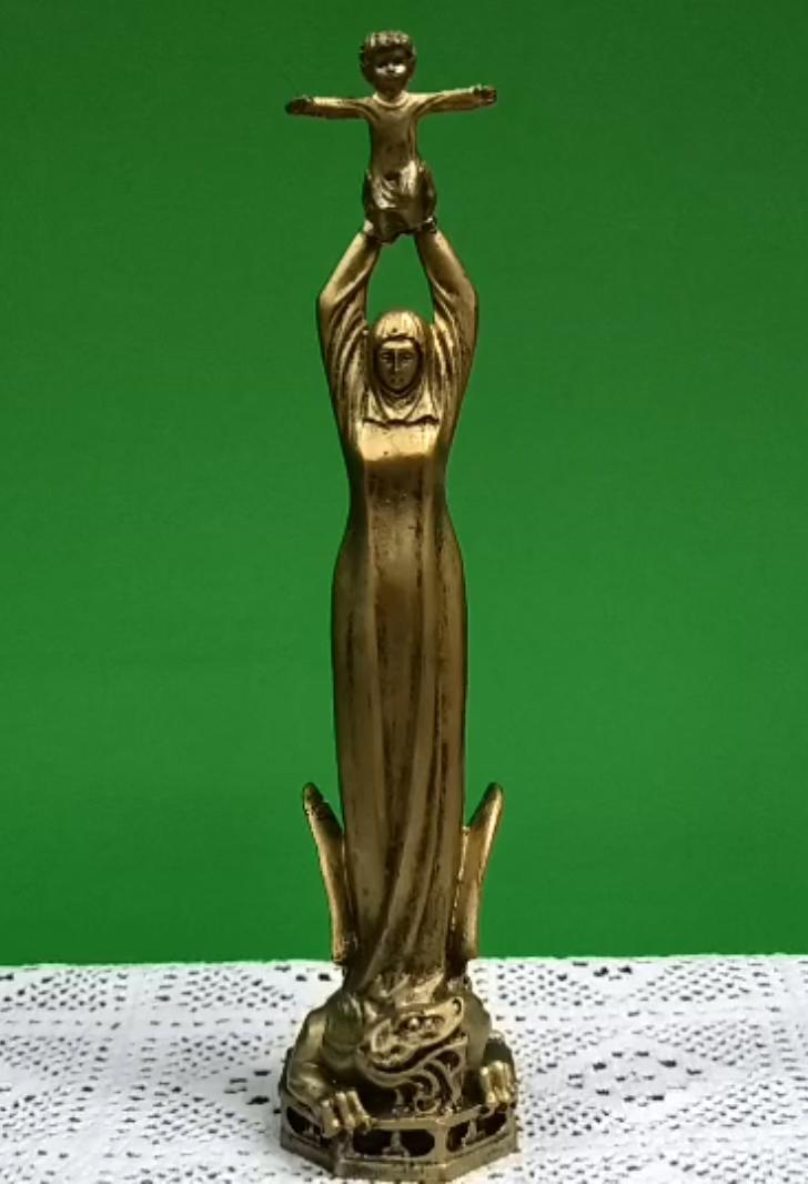 圣婴耶稣:在原来的作品当中,圣婴耶稣是挺胸直视,双臂平直地伸展。这既象征着圣子耶稣在受难时伸开双手,以战胜死亡显示复活的全能,同时也向世界展示了祂对世人的深爱与祝福。同时,当我们从远方看的话,张开双臂的圣子呈现的是一个十字架形。圣母高举十字架(耶稣)战胜了魔鬼(毒龙)。再从圣婴耶稣的身体比例上来看,小耶稣虽是圣婴的一个形象,准确地说应称之为幼儿。但是祂的身体比例却和普通儿童不尽相同。雕像的作者在这里是仿效了教会初期拜占庭艺术中圣婴有着和成人一样的比例的这一做法,适当地拉长了圣婴的身材。这样做,为的是当圣婴伸开双臂时就好似形成了一个“十字架”的形状。