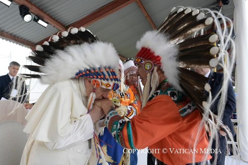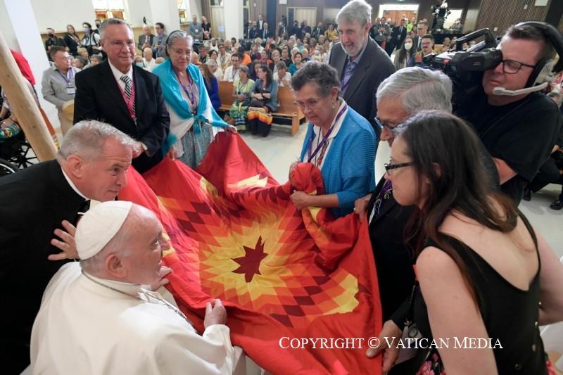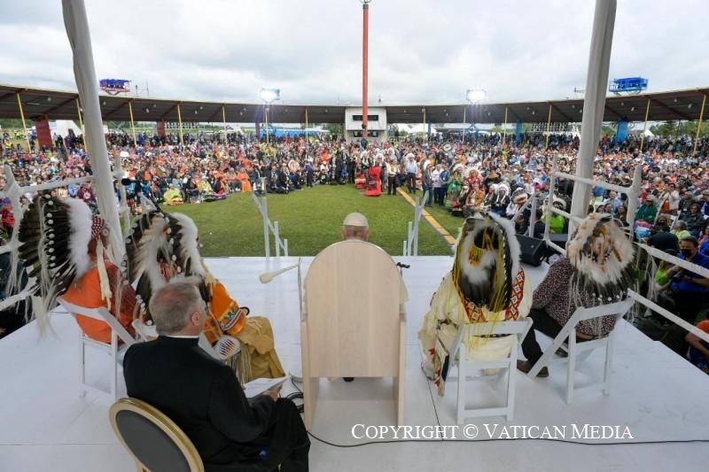 当教宗在会场落座时,来自全加拿大的原住民领袖们头戴“战冠”( war bonnets,一种羽毛头饰)、手持“鹰羽杖”,伴随着鼓点,列队在人群中走过。当地的司仪解释说,酋长们如此打扮,是因为他们必须是捍卫自己族众、语言、习俗和儿童的勇士。另外,数十人举着一条长长的红色横幅穿过人群,横幅上写着4120名死亡儿童的名字和他们所在的学校。加拿大总督玛丽·西蒙和总理特鲁多亦出席了该会议。