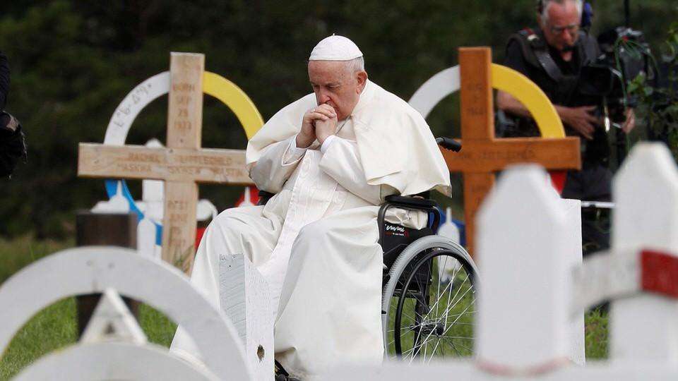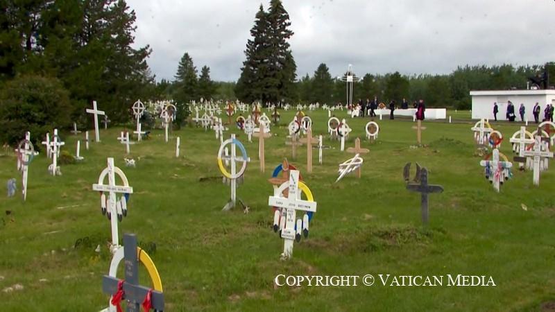 教宗在距离会场很远的地方便下了车,他坐在轮骑上,在淅淅沥沥的小雨中经过了克里族的墓园,这里葬着许多寄宿学校的受害儿童。教宗在墓园中停留了片刻,面向一个个插在土地上的十字架坟冢静默祈祷。