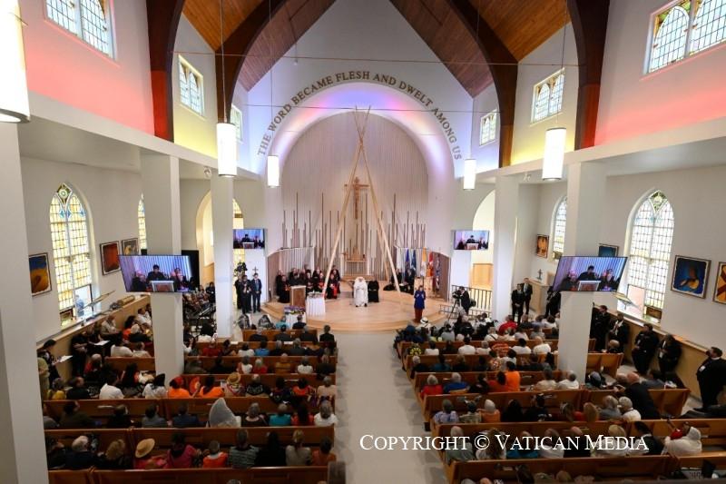 当天下午,教宗回到埃德蒙顿市,并在傍晚时分拜访了市中心的第一民族的圣心堂。他聆听了两名堂区成员的见证分享,并向信友们发表了一篇真挚的问候辞,结束了7月25日一天的访问。