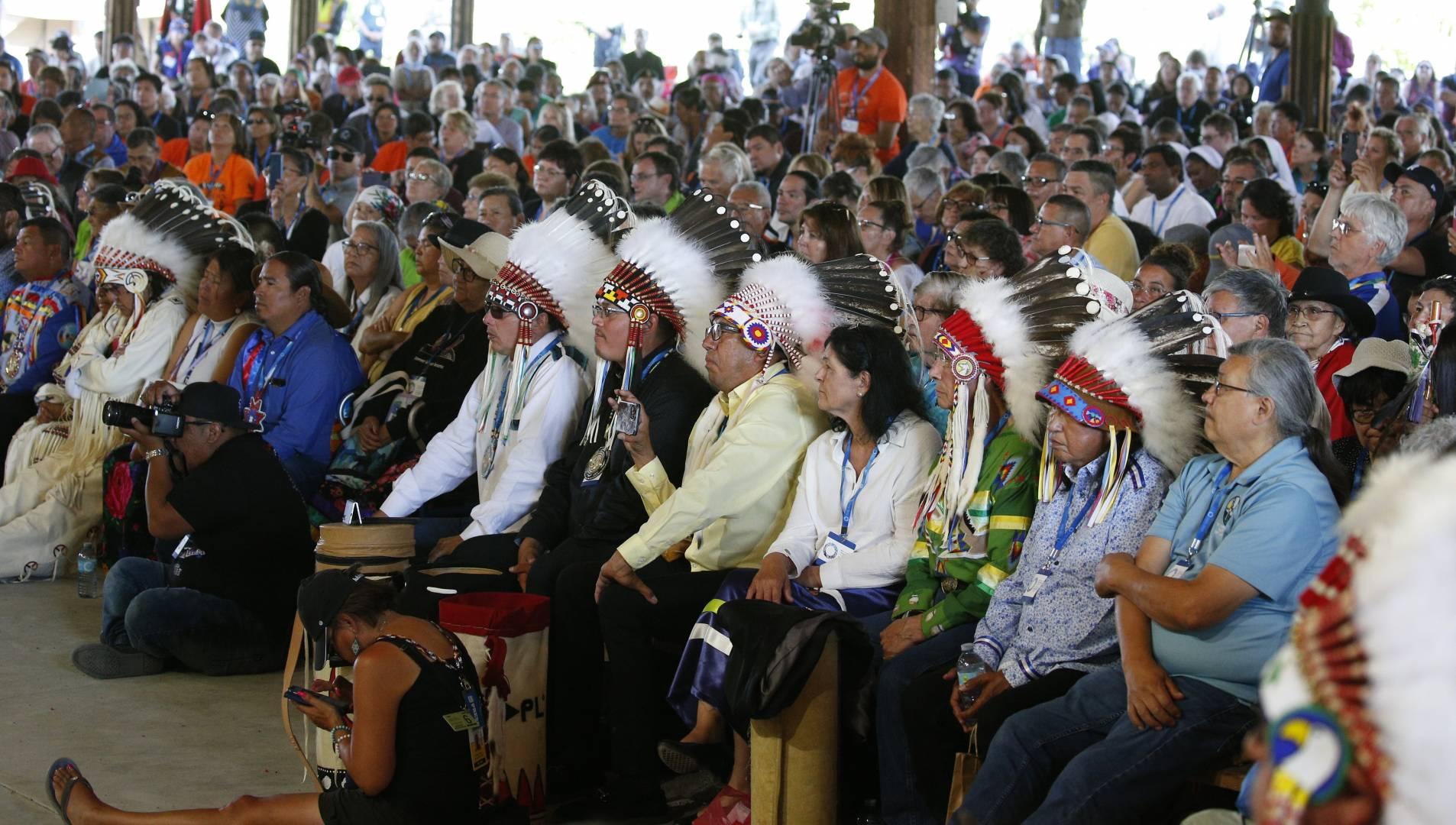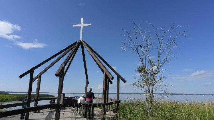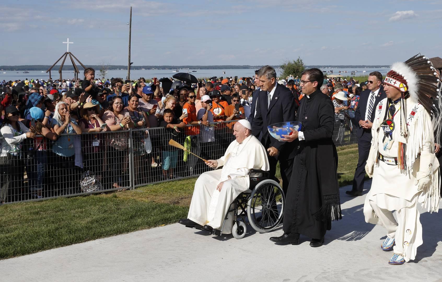 傍晚时分,教宗参与了当地的“圣亚纳湖朝圣活动”。这个位于亚省中部的湖泊,长久以来被尊崇为原住民的精神和文化圣地。它被纳科塔苏族人(Nakota Sioux)称为 “天主之湖”(Wakamne),被克里族人称为“圣神湖”(Manito Sahkahigan)。天主教的朝圣活动于1889年首次在湖边举行,此后便成为年度的朝圣活动。如今,它是加拿大西部最大的年度天主教聚会,每年吸引多达4万名朝圣者。2004年,圣亚纳湖被指定为加拿大国家历史遗址。