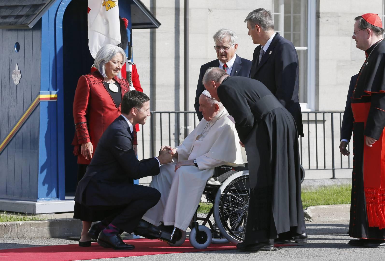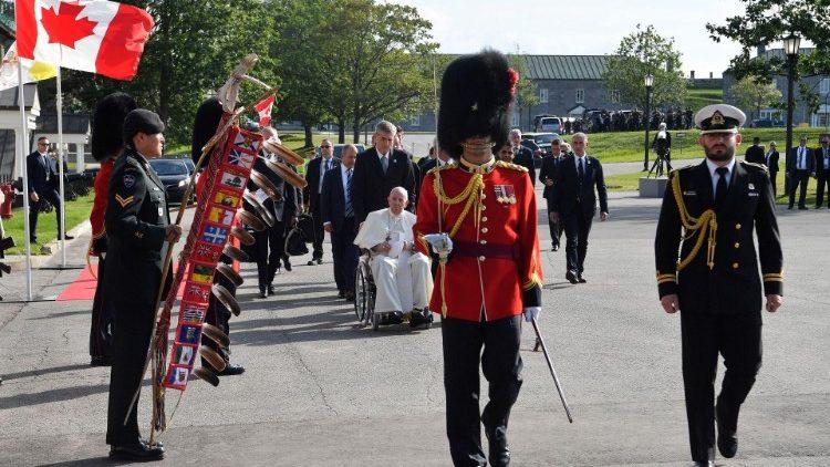 7月27日,加拿大访问之旅的第四天,教宗方济各作为梵蒂冈城国的元首,受到了来自加拿大政府的官方欢迎——包括仪仗队的引领、加拿大和梵蒂冈国歌的演奏、与该国总督和总理的私人会晤,以及面向民政当局、外交使团、宗教领袖和原住民代表的讲话。