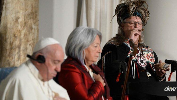 私人会晤结束之后,教宗前往会议厅,展开与加拿大民政当局、外交使团和原住名代表等的会议。在会议的开始,如前几天一般,原住民用他们的方式向教宗表示了欢迎。一位原住民长老用野火鸡的羽毛举行了他称之为“香薰礼”的仪式,以“净化空间”。