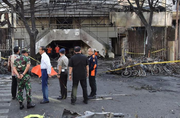 5月14日上午发生在东爪哇省省会泗水警察总部的一次炸弹袭击,几乎可以肯定是自杀式袭击。警方发言人曼杰拉(Frans Barung Mangera)证实,袭击发生在上午8时50分在该建筑物入口附近,由5个恐怖分子的家庭发动袭击,他们在两辆摩托车上自爆,导致4名警察和6名平民受伤。与该组一起的1名8岁女孩生还,现在正留院医治。警署炸弹发生前数小时,在徐图利祖镇(Sidoarjo)住宅亦发生爆炸,有3人遇难。伊斯兰国宣称恐怖袭击由他们发动。目击者称,其中1名摩托车手是男子,还有1名女子和1名坐在乘客座位上的小孩。曼杰拉说:教堂和徐图利祖镇的袭击之间有联系, 使用相同类型的爆炸物。(亚洲新闻/通讯社)