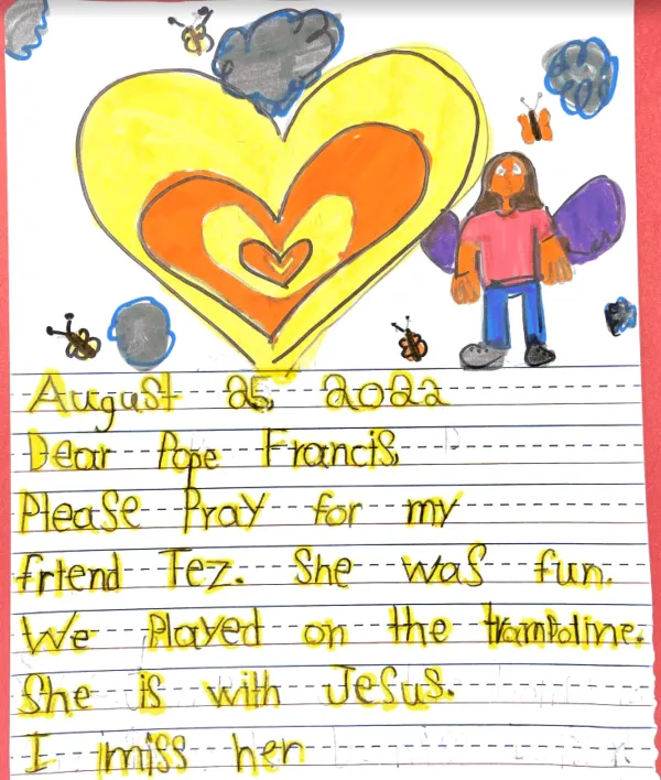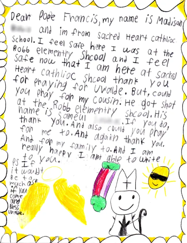 一位四年级的学生在信中画了一幅关于教宗方济各的画,并写道:“我喜欢艺术。枪击案发生时,我就在罗伯小学,我感到非常害怕。现在我转到了一所更好的学校。希望你能为我、我的家人和朋友祈祷。”该信件以圣心学校的座右铭——“一切为了耶稣”——结束。