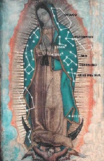 《默示录》中说:“天上出现了一个大异兆:有一个女人,身披太阳,脚踏月亮”。画像中,玛利亚全身放射出太阳的光环。墨西哥原始土著民因崇拜太阳神,一眼便能认出该像中光芒的意义:光源来自于母腹中胎儿。而圣母就是光的母亲,是真神的母亲。据天文学家研究结果发现,圣母的外氅由繁星点缀着。这些星辰精确地标出了当地晚间的星象图。它们在总数上和位置上形成了在墨西哥地平线上所能看到的最亮的46颗星星。