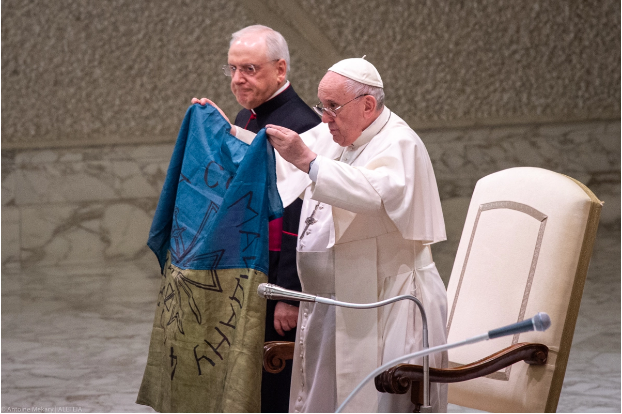 俄乌战争爆发数小时之后,教宗决定亲自前往俄罗斯驻教廷大使馆,与俄罗斯大使交谈。之后,在4月6日的周三公开接见活动中,他亲吻了刚从布查镇(Boutcha)带回的乌克兰国旗。在那里,许多无辜的生命被屠杀。