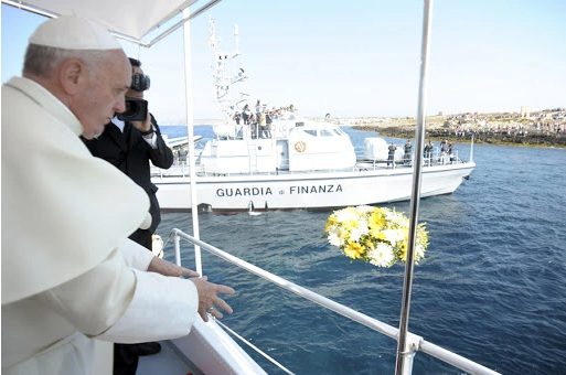 教宗方济各刚上任不久,就决定在前往意大利的兰佩杜萨岛(Lampedusa),哀悼溺水的移民。面朝大海,沉思片刻后,他将花圈扔进水中,缅怀在地中海遇难的数千移民。据统计,从2014年到2020年,超过2万名移民在地中海遇难。