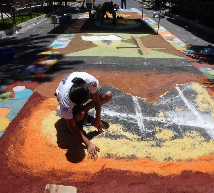 萨尔瓦多是位于中美洲的一个国家。该国年轻的天主教信友以充满新颖的方式来致敬耶稣的苦难。他们会拿着几桶准备了数周的彩色木屑,手脚并用地花上几个小时,只为赶在圣周五前制作一张大的“地毯”,上面描绘了耶稣受难、死亡和复活的不同场景。在他们漫长而艰苦的工作之后,复活节的游行队伍将走过这条地毯,向所有为此努力的年轻信友表示敬意。