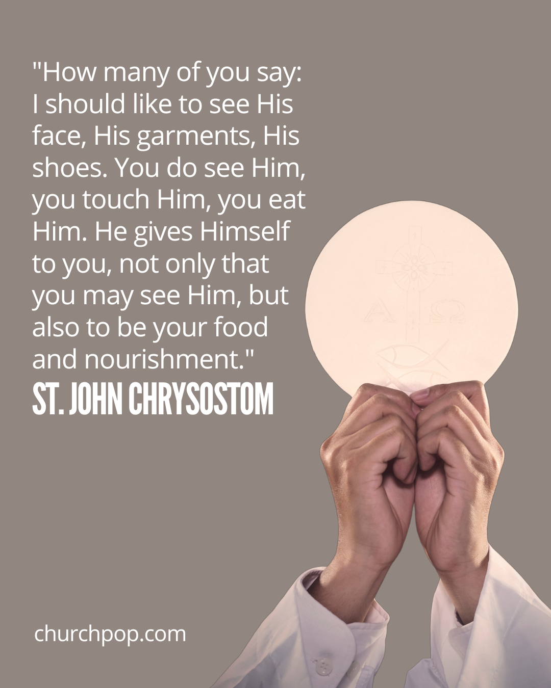 2、金口圣若望曾说:“你们中有多少人说:我想看看祂的脸,祂的衣服,祂的鞋子。你确实能看见祂,触摸祂,品尝祂。祂把自己赐给你们,不单是为了让你看见祂,而且还是为了使祂自己成为你的食物和生命的滋养。”