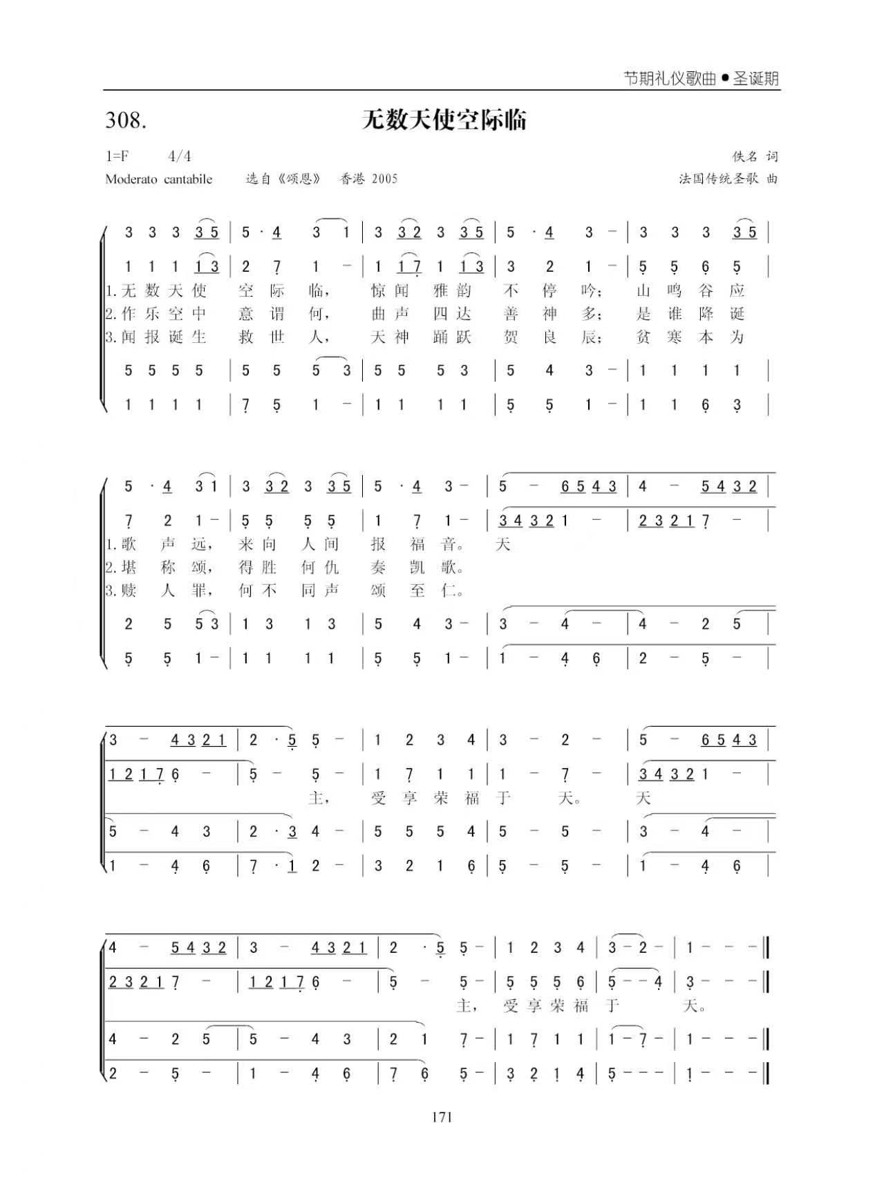 《无数天神空际临》结尾两句有的歌本是“天主受享荣福于天,良人受享太平于地”,建议这样唱。