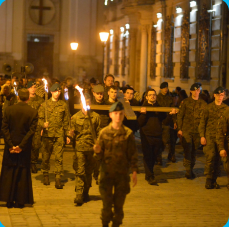 据Churchpop网报道,波兰弗罗茨瓦夫市(Wrocław)在圣周五举办了是的一年一度的“大学生十字苦路”活动,约有超万名大学生参加,并有学生团体共同搬运了一个巨大的木制十字架参与游行。