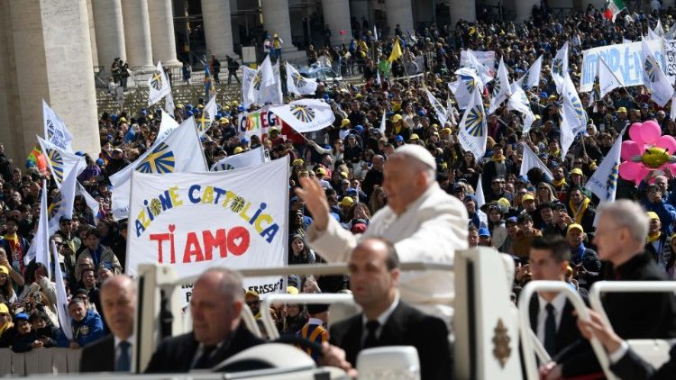 据梵蒂冈新闻网报道,4月25日,教宗方济各在梵蒂冈的圣伯多禄广场接见了来自意大利各地的6万名意大利公教进行会的成员和朋友,表示从他们的眼睛里上看到了充满喜乐和希望的目光,并这如此强烈而美好的拥抱表示感谢。”