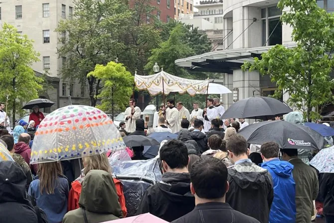 据CNA网报道,5月18日,星期六,1000多名信友不顾零星降雨,在华盛顿市中心的街道上举行了敬礼大圣若瑟的圣体游行。这是由“天主教信息中心”(Catholic Information Center)组织的第二届年度圣体游行。此次活动的地点选择在距离白宫仅有几个街区的地方,吸引了该地区的神父、修女和平信徒参加。据统计,今年游行规模的人数几乎是去年的两倍。