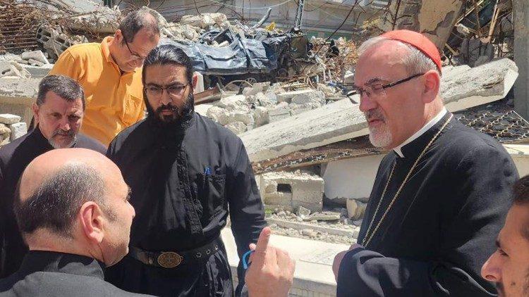 自加沙爆发冲突7个月后,加沙圣家堂本堂司铎罗马内利神父与皮扎巴拉枢机一行人回到他的堂区信友中间。