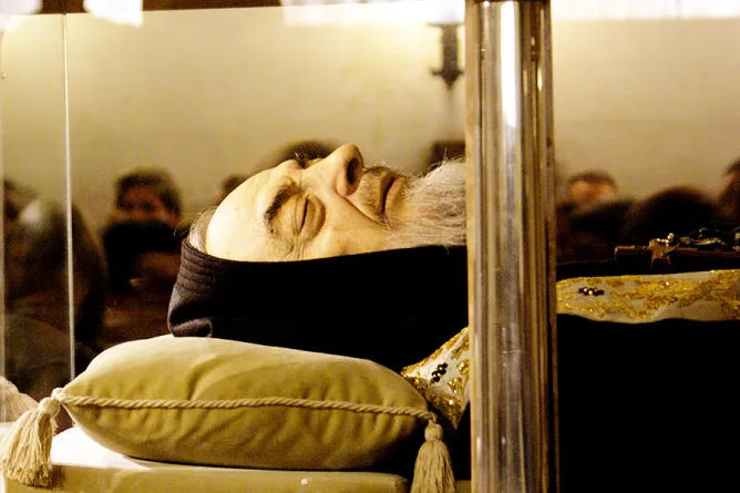 1887年,比约神父出生在一个农民家庭。早在孩童时期,他就以热心的灵修生活而广为人知,15岁时加入了嘉布遣会方济各会。1916年,他搬到圣乔瓦尼罗通多,在那里度过了一生大部分的时光。他的一生中充满了许多奇迹和非凡的苦难,除了他可以同时出现在不同的地方和悬浮(飞翔)等神恩外,他还印有基督的神圣五伤,并遭受来自魔鬼的攻击。