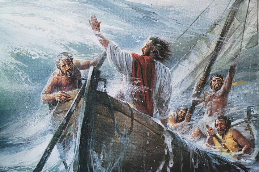 有一天晚上,耶稣对门徒们说:“我们渡海到对岸去吧!”他们就离开群众,耶稣已经在船上,他们就载他走了;和他在一起的还有别的小船。忽然,狂风大作,波浪打进船内,小船就积满了水。耶稣却在船尾靠着枕头睡着了。他们叫醒他,对他说:“老师!我们要淹死了,你不管吗?”耶稣醒来,斥责了风,又对海说:“不要作声,静下来!”突然间就风平浪静了。耶稣对门徒说:“你们为什么这样胆怯?怎么还没有信德呢?”他们非常惧怕,彼此说:“这人到底是谁?连风和海洋都听从他。”