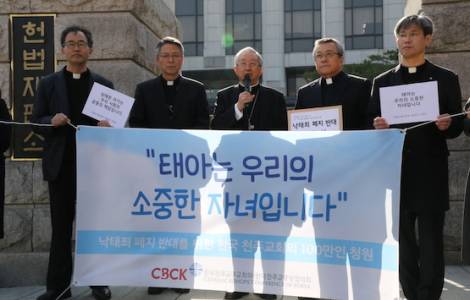 韩国天主教会于六月十六日在首都首尔举行了大规模的“捍卫生命”示威游行,向堕胎合法化说不、重申教会将积极致力于保护未出生生命的努力。示威民众强调了这一法规的合法性;“将抵制取缔禁止堕胎的决定”,借此捍卫母婴的生命。首尔总主教区总主教廉洙政枢机在游行队伍抵达总主教座堂后发表讲话,呼吁全体同胞接纳、尊重生命。指出堕胎不是最佳的选择,而且这根本不是可以作出选择的问题。韩国专门为此成立了“生命文化”联盟,强调生命的价值与尊严。部分民间社会认为女性有自主决定堕胎,但天主教会指出,取缔禁止堕胎法并非尊重女性权力。(信仰通讯社)