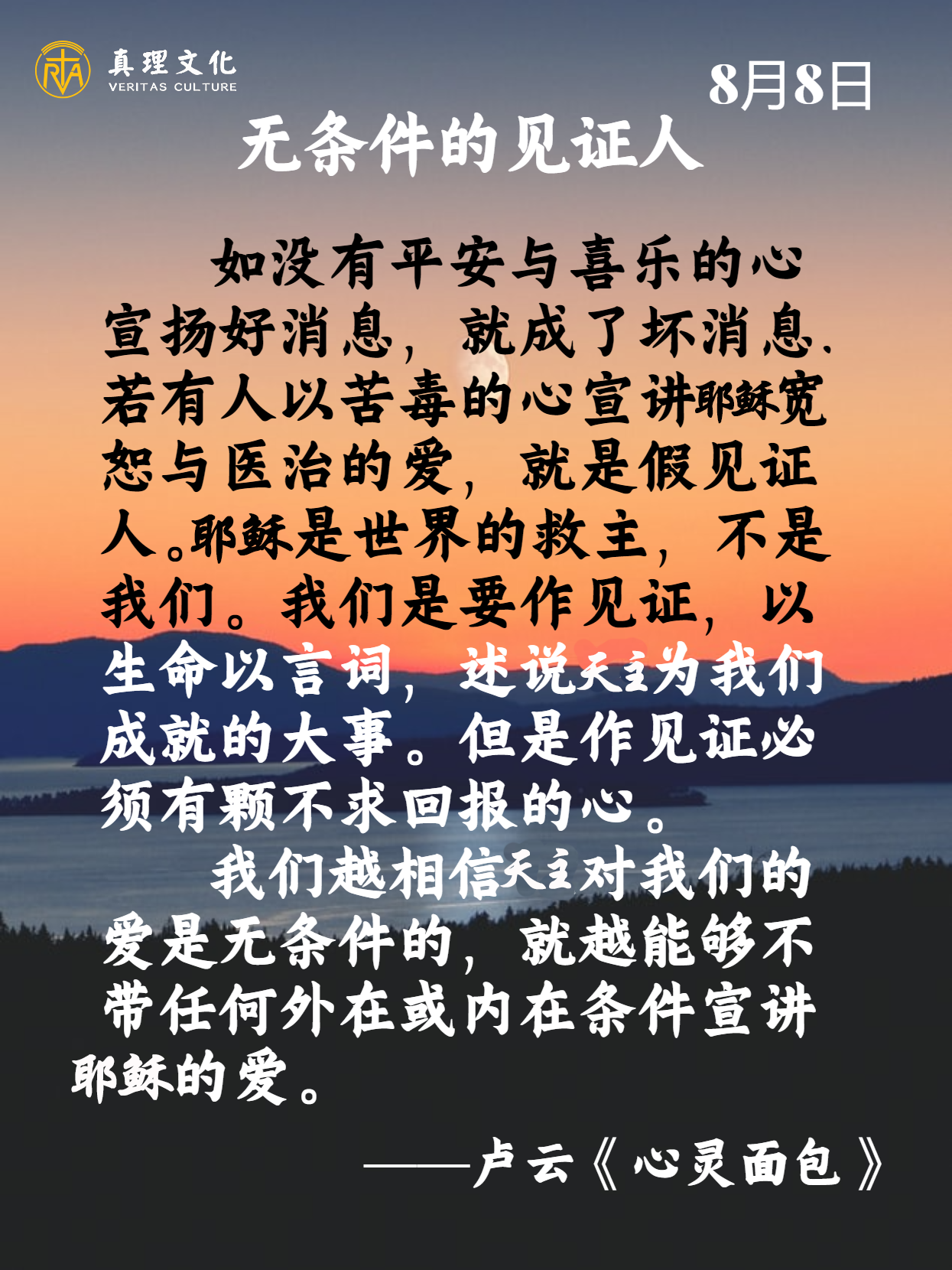 耶稣问门徒们说:「你们说我是谁?」伯多禄回答说:「你是默西亚,永生天主之子」— 这来自天父的启示,蕴含我们生命的全部意义和价值。无论我们在人生的哪个阶段,正在从事甚么样的学习或工作,积累了多少的荣誉或财富,如果我们不宣认耶稣基督是主,我们就会以这世界的标准来生活。如果我们只属于世界,生命难免只会落得空虚与悲哀。