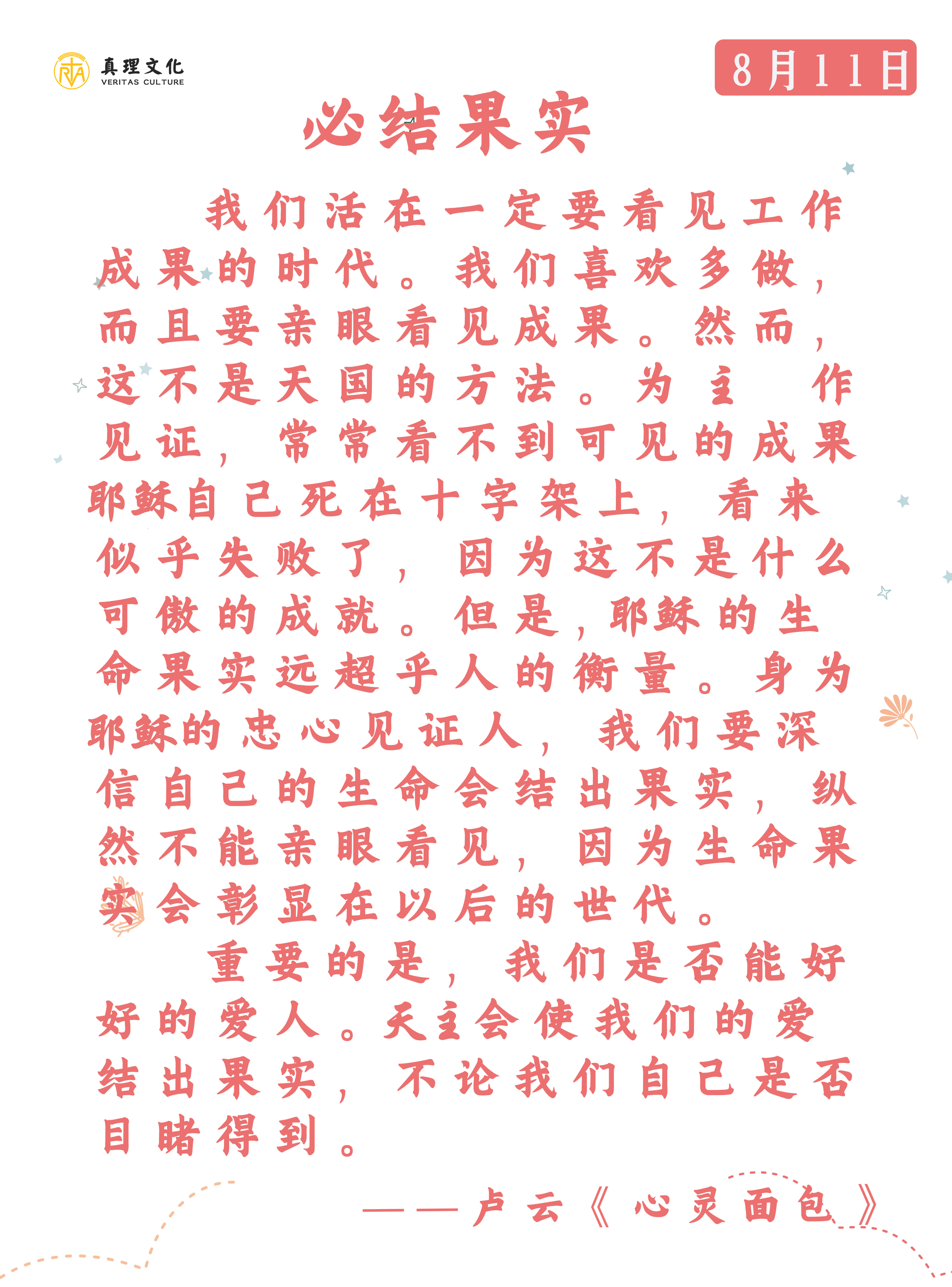 耶稣说:「我所要赐给的食粮,就是我的肉,是为世界的生命而赐给的。」今天,我们在弥撒中,仍然真实地领受这生命的食粮。这食粮是我们每天的生活动力,让我们找到生命的中心,内心的平安与喜乐。面对这份来自天上的恩赐,我们的回应便是知恩报爱。每一天,每一刻,我们在学习主耶稣的样子,把自己交出来,为他人服务,尤其是为生活在边缘,不被人关注到的弱小者。如此,耶稣的生命,便活生生地临在于我们每天的生命中,也让更多的人藉此感受到生命的意义,感受到在我们中间的耶稣。我们接受这食粮的同时,也将这食粮与别人分享。这样,我们众人便分享着同一的食粮与生命。