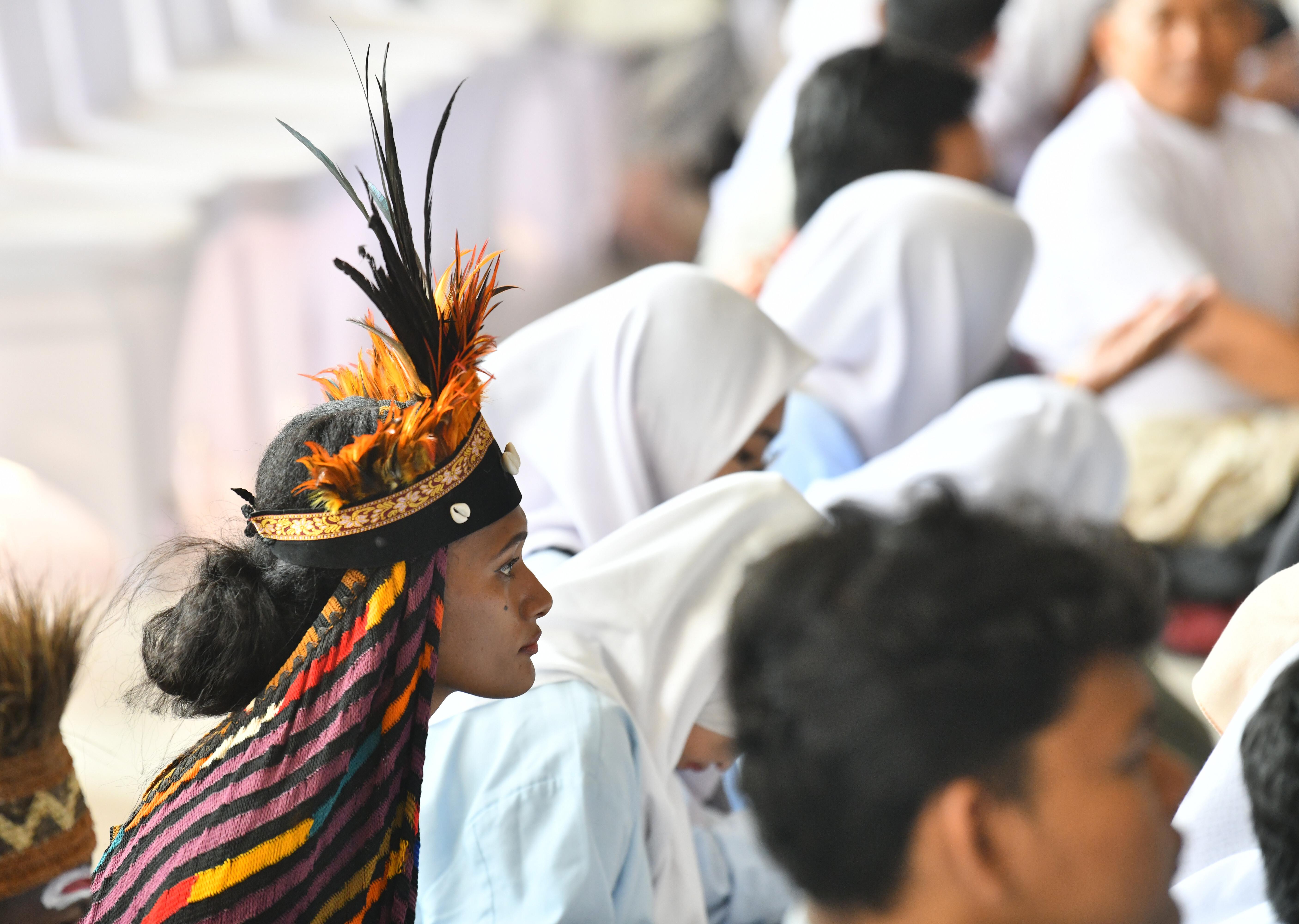 教宗为在场儿童送去了一个又一个拥抱:他们中有的是聚集在城郊和乡村、被道明会修女抚养并教育的儿童,还有的是和平学校的小孩(整个印尼群岛共有18所和平学校,收留了超过3000名儿童)。这些孩子们捐赠了“我想要的世界”图画,这幅画描绘了一个由世界上所有国家的国旗组成的两只手臂托举着的地球,且双手连结紧靠一起,象征着兄弟情谊。”