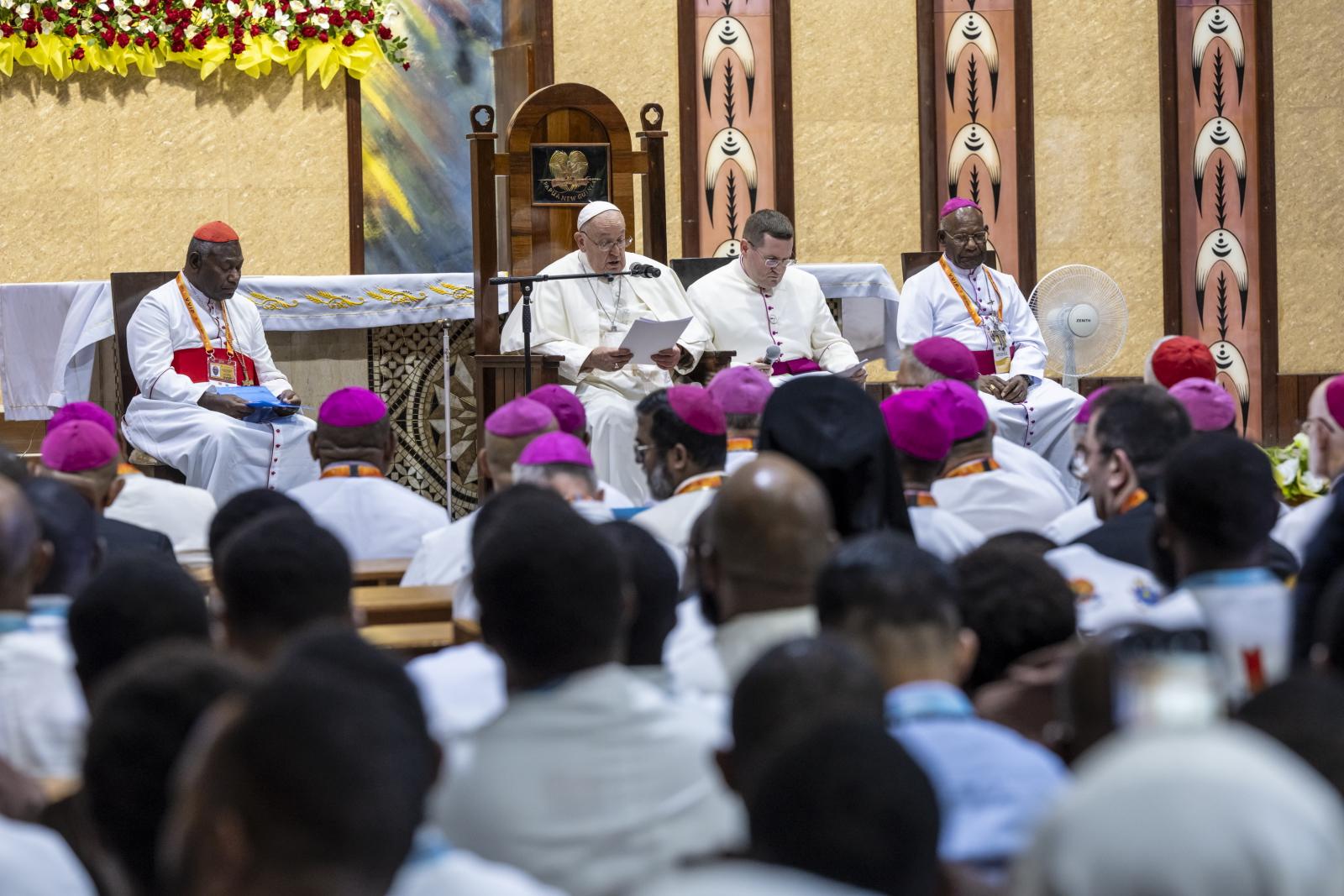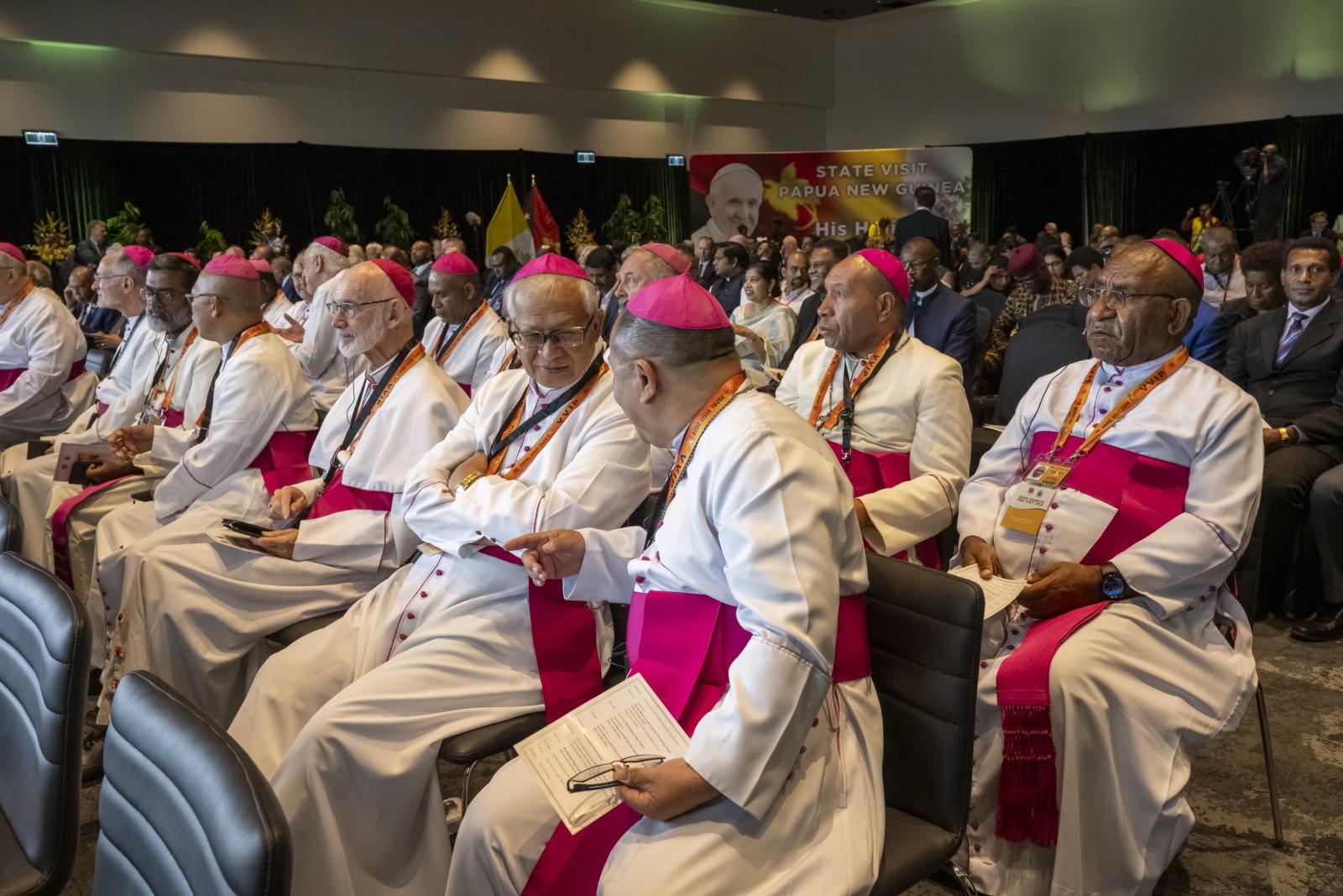 巴布亚新几内亚和所罗门群岛主教团主席舍帕利(Otto Separy)主教在向教宗的致词中,感谢教宗的到来。他说,“对于这片土地上的教会和我们每个人而言,教宗的临在是一份宝贵的礼物,因为他坚固我们在至一信仰中的共融”。