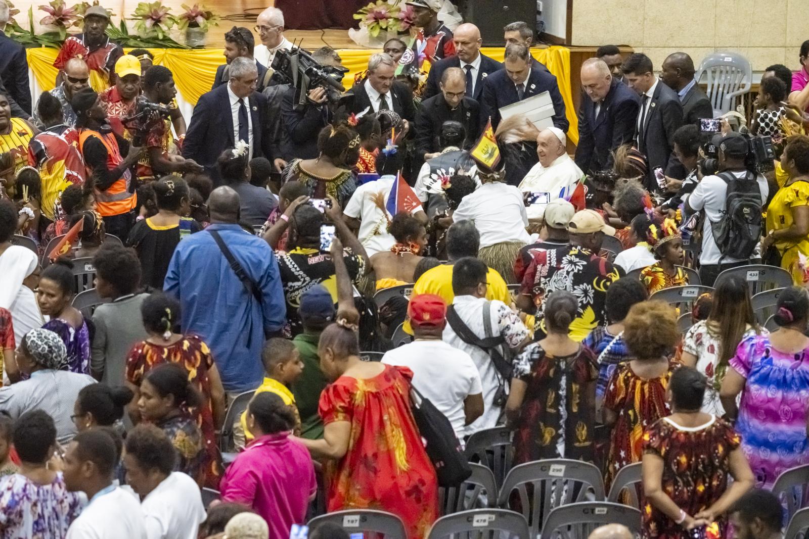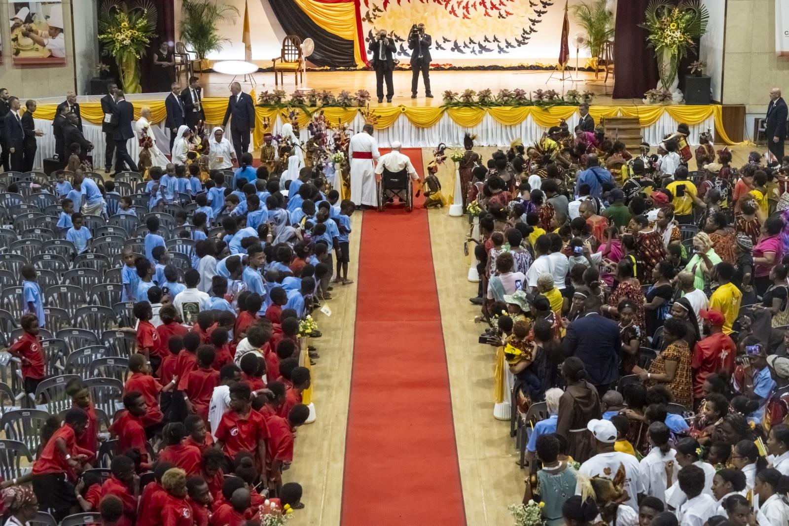 在明爱技术学校等待教宗的是身穿传统服装或不同校服的青年和儿童。莫尔斯比港的总主教里巴特(John Ribat)枢机向教宗致辞后,孩子们为教宗表演了传统舞蹈,接着有两名儿童各自向教宗提出了一个问题。
