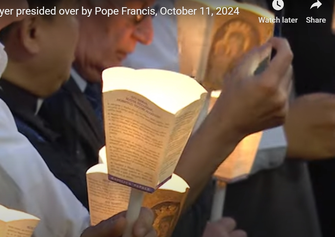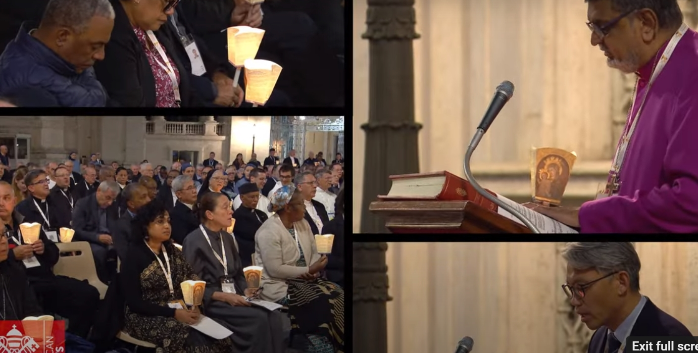 世界主教会议与会者在梵蒂冈参加了大公守夜礼,由泰泽团体和其它教会的兄弟代表提供礼仪服务。