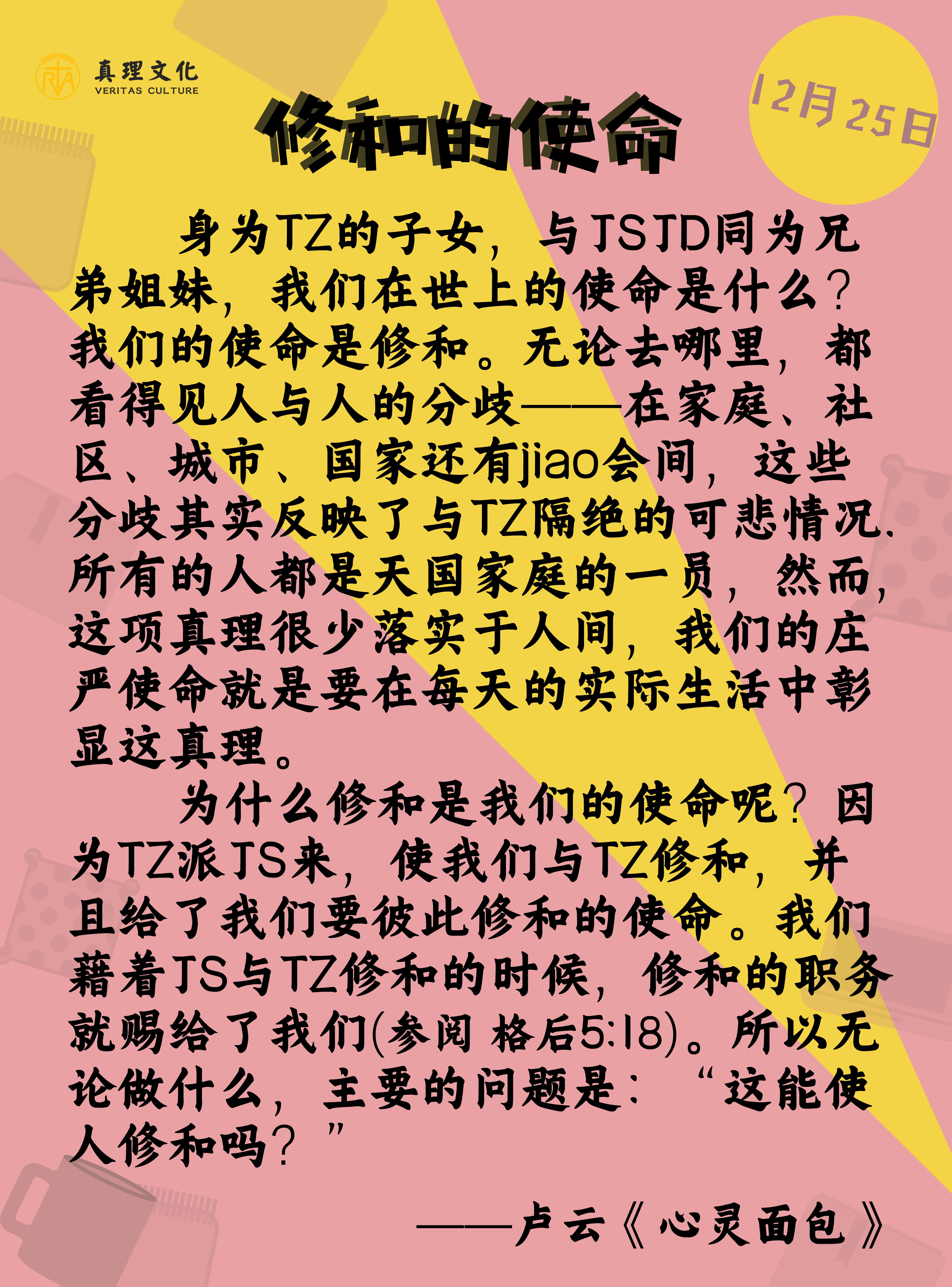 这样的一个大喜讯,絶不能只有少数人获悉,但要给世界广传!传报福音的使命,无需等待耶稣复活才开始,而是此时此刻,当我们经验到天主与我们同在,便要全心全灵全力地去同他人分享。在我们与亲朋好友庆祝圣诞节的日子,让我们透过默观主耶稣降生成人的奥迹,更深入地认识到那位时刻与我们同在的天主,更仔细品味祂的永恒大爱。