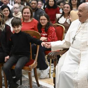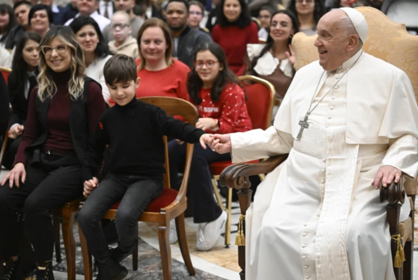 教宗方济各周五在梵蒂冈的克莱门汀大厅欢迎了一群来自意大利盲人和视力障碍者联盟的儿童和年轻人,鼓励他们在 2025 年禧年期间成为希望的朝圣者。