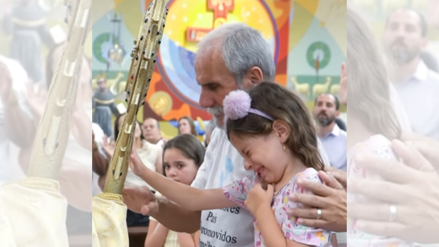在摄影师内托于今年一月底发布的简短视频当中,一位来自巴西的小女孩参加了当地教会的一个神恩团体组织的朝拜圣体的礼仪。在礼仪中,手捧圣体光的神父会走近信友们,向他们显扬圣体。这位小女孩和其他信友一起伸出手,虔诚地触摸圣体光。当她一摸到圣体时,就情不自禁地哭了起来。很显然,她被深深的情感所打动。