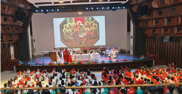今天早上7:30已经来到电台的340多孩子们就穿着漂亮的圣诞服装,由义工带领排着长长的队伍有序地进入音乐厅,开始了今天的圣诞庆祝活动。8:00弥撒感恩圣祭开始,由电台新任总经理费尔玛神父用菲律宾语主持,若望神父、方济神父、安布神父和一位越南神父共祭。弥撒歌曲、读经分别由孩子们负责咏唱和诵读。弥撒结束孩子们先吃了恩人们准备好的点心稍作休息。几位年轻充满活力的青年人带动了今天的节目,他们邀请不同年龄的孩子们参与精彩表演。孩子们的欢呼雀跃声充满了音乐厅的每一个角落。他们也分组表演了已准备好的圣诞歌舞。