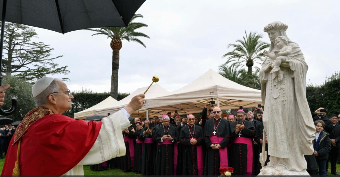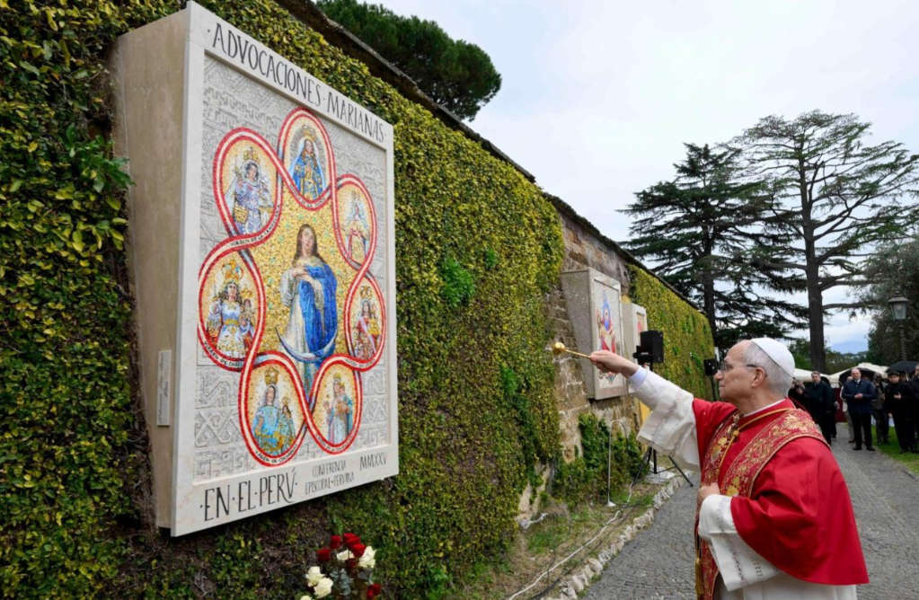 教宗良十四世在梵蒂冈花园为一幅圣母玛利亚马赛克镶嵌画和利马的圣罗撒(St. Rose of Lima)画像祈福,并称赞这位出生于美洲的第一位圣人是我们尘世成圣之旅的典范。