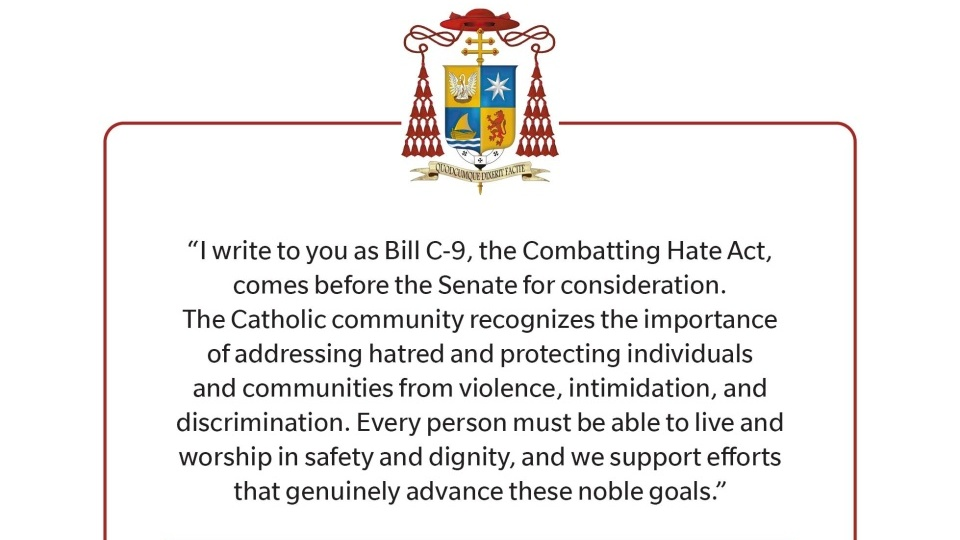 2026年3月25日,《C-9号法案——打击仇恨法》在加拿大众议院以188票对144票通过三读。该法案现已提交参议院作最终审议及考虑。法案中多个内容引起信仰团体的严重关注。3月27日,多伦多总教区总主教里奥枢机致函全体加拿大参议员,恳请他们在审议法案时作出修订,回应信仰领袖、公民自由专家及众多人士所提出的严重关注。