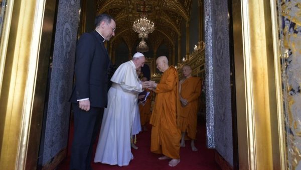 ♦教宗11月21日上午前往曼谷叻察波披寺(Wat Ratchabophit Sathit Maha Simaran)拜会了泰国第20任僧王颂德帕玛哈穆尼翁九世(Somdet Phra Ariyavongsagatanana IX)。泰国僧王首先向教宗致欢迎词,回顾了35年前圣若望保禄二世教宗历史性的访问。他表示天主教与泰国的佛教有著“深厚持久的友谊”,“以相互理解与平等合作的真精神团结在一起”。教宗在致词时肯定,此次会晤是“双方的前任业已开始彼此尊重和承认之旅的一部分”。重申他个人及整个教会的承诺,“致力于促进开放和尊重的对话,从而向泰国人民的和平与福祉服务”。并鼓励两个宗教团体的信友发展新的慈善项目,特别是针对穷人和我们饱受剥削摧残的共同家园,产生并扩大实际的行动。(梵蒂冈新闻网)