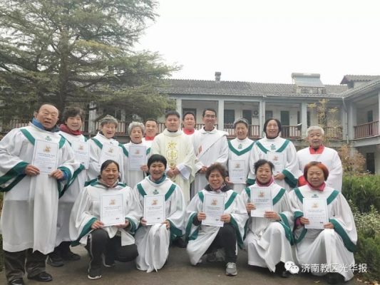 ♦11月24日,耶稣普世君王节。济南教区西门堂区在弥撒中为11位弟兄姐妹举行了非常务送圣体员派遣礼。这11位弟兄姐妹经过学习,顺利通过了考试,接受本堂韩承博神父的派遣。他们将担任为期一年的堂区非常务送圣体员职务,为堂区内行动不便、无法进堂参与弥撒的老弱病患教友服务。(信德网)