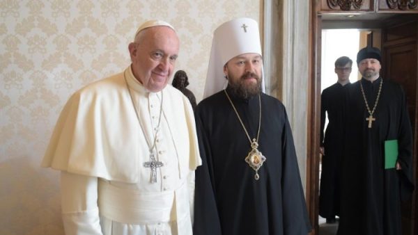 莫斯科及全俄罗斯东正教对外关系部门负责人希拉里翁总主教2月13日上午在梵蒂冈拜会了教宗方济各。此次出访是希拉里翁(Hilarion)总主教前来罗马参加纪念教宗方济各与基利尔宗主教历史性会晤4周年的相关活动。希拉里翁总主教和科赫枢机领导的俄罗斯东正教会与天主教会混合小组于2月13日上午举行会议,评估了4年来为落实教宗方济各与基利尔宗主教在哈瓦那发表联合声明后,双方教会在文化和社会计划上的进展。希拉里翁总主教表示:“俄罗斯东正教会完全分担教宗对中东的挂虑,说实在的,这挂虑也是促使教宗与宗主教4年前会晤的主要动机。的确,在中东发生灭绝基督徒的事件。西方媒体和政界人士长久以来宁愿不看和不谈论那里的情况,而教宗和宗主教则最先谈到这种情况是一种威胁,设法引起世界媒体的关注。我们必须竭尽所能保护基督徒在中东的临在。”
