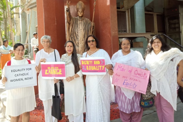 3月8日,在周日弥撒之后,六名妇女站在印度孟买圣名大教堂外举着海报,要求在教会内实现性别平等。参加该活动的神学家弗吉尼亚·萨尔达尼亚说,国际志愿组织“信仰之声”发起了这项全球运动,以“呼吁天主教徒中的妇女享有平等和尊严”。