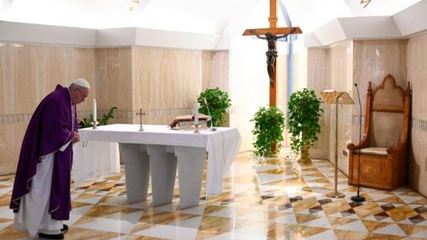 3月16日,教宗方济各继续在圣玛尔大之家主持清晨弥撒,并借由网络直播,关怀在新冠病毒紧急危机下无法参礼的信友,也为病人和家庭祈祷。