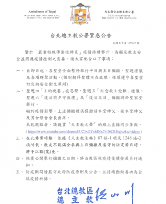 3月20日,台北总主教公署发布紧急公告,表示因新冠疫情,全面暂停举行平日与主日弥撒及各项信众聚集活动,圣周四至圣周六的礼仪都将以网络直播的方式进行。