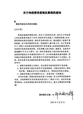 另据本台资讯,浙江温州教区于3月22日发起为意大利募捐活动。据该教区发出的募捐通知表示,在温州遭受疫情肆虐的时候,欧洲曾帮助过他们,尤其是圣座捐赠给中国的70万个口罩中,有部分特别给了温州地区使用。为了回报这份恩情,温州教区发起了募捐,并且呼吁教友为欧洲疫情的平息做九日敬礼。