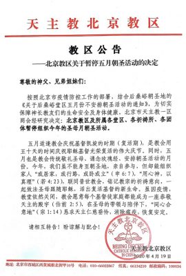 4月19日,北京教区发布公告表示,因疫情防控需要,北京教区及所属各堂区、各祈祷所、各团体暂停组织今年的圣母月朝圣活动。同时,公告邀请信友居家祈祷,使家庭成为恭敬天主的殿宇。最后,公告呼吁信友在圣母的陪伴下,恳求天主,早日消除瘟疫。(北京教区)