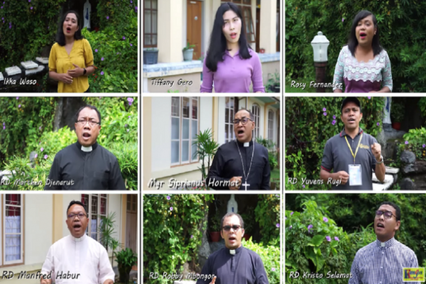 日前,印度尼西亚鲁滕教区霍玛特(Siprianus Hormat)主教、明爱负责人鲁吉(Yuvensius Rugi)神父与其他几位司铎及年轻天主教徒录制了一首名为《你为我们而战》的歌曲,为奋战在新冠疫情前线的医护工作者们加油打气,并将歌曲视频上传到了网络,目前已有接近一万名网友收看了该视频。